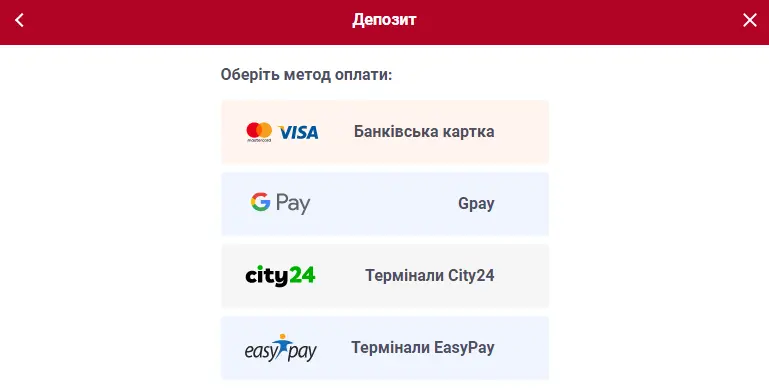 | Асортимент доступних платіжних систем для депозиту та виведення коштів | 3 бали | 3 бали за повний асортимент ліцензованих платіжних систем, 1-2 бали за частковий, 0 за мінімальний |