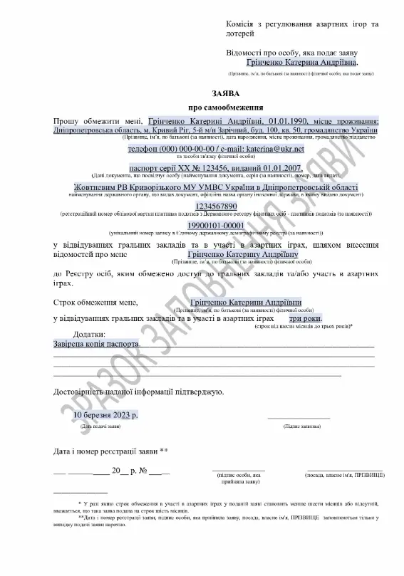 Надіслати заповнену заяву на самообмеження на електронну пошту регулятора;