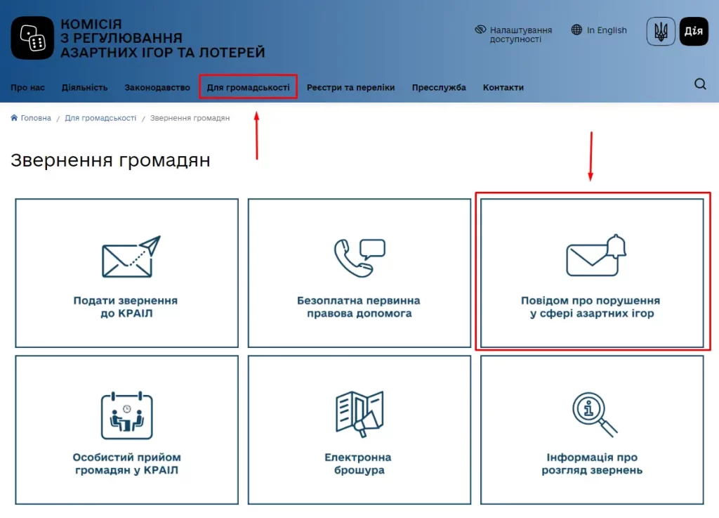 Для підтримки порядку у сфері гемлінгу Комісія з регулювання азартних ігор та лотерей приймає звернення від громадян (гравців). Особливо цікавою є можливість повідомити про порушення у сфері. Тобто, щоб поскаржитися на онлайн заклад вам достатньо перейти на сайт Комісії, відкрити в меню розділ для громадян та натиснути на напис звернення громадян. Далі натискаємо на кнопку Повідом про порушення у сфері азартних ігор. Ці розділи я вказав стрілками на скріншоті нижче.