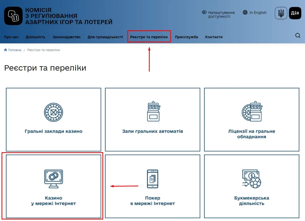 Найкращий спосіб перевірити наявність ліцензії – це відвідати сайт КРАІЛ. Там необхідно відкрити розділ з реєстрами і далі вибрати кнопку з параметрами, що вас цікавлять. Наприклад, це можуть бути реальні зали з ігровими автоматами та іграми, ліцензії грального обладнання, казино або покер в Інтернеті і так далі. Якщо вас цікавить наявність ліцензії у певного онлайн казино, то скористайтеся нижченаведеною картинкою. На ній я виділив потрібні вам розділи та кнопки.