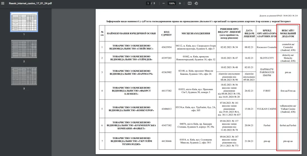 Натиснувши на позицію Казино у мережі Інтернет, ви автоматично завантажите PDF файл на кілька аркушів. У ньому будуть зазначені абсолютно всі заклади, які мають дозвіл на прийом ставок в українських гравців. У правому стовпці будуть відзначені доменні імена. Саме цим сайтам можна довіряти, оскільки вони працюють під контролем національного регулятора України.