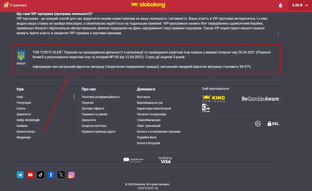 Уникати маловідомих брендів. Не довіряйте сайтам, які не надають або навмисно ховають свої контактні дані чи інформацію про юридичну особу. Якщо клуб легальний і працює по закону, то він обов’язково вкаже всі ці дані у футері сайту. На скріншоті знизу показано футер ліцензійного онлайн-казино України.