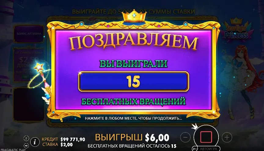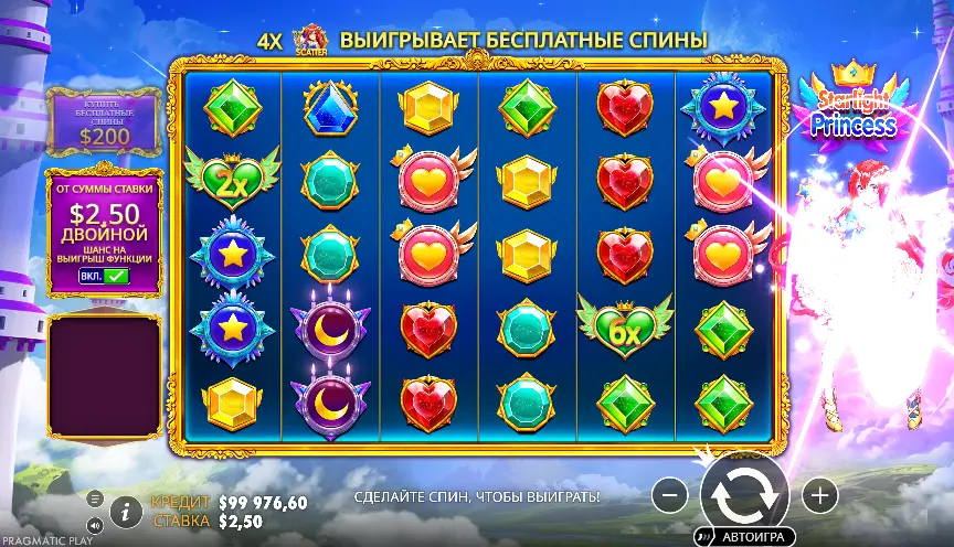 Starlight Princess від Прагматика – це повноцінна пригода у світі магії, світла та великих виграшів. Провайдер створив продукт, який поєднує видовищність, продуману механіку та високий потенціал виплат. Система множників та каскадні спіни роблять кожен раунд унікальним, а бонусна функція з накопиченням множників перетворює гру на справжній феєрверк емоцій. Незалежно від того, чи хочете ви випробувати успіх на гроші або просто насолодитися атмосферою в демо-версії, Зоряна Принцеса дарує ідеальне поєднання азарту та візуального задоволення. Цей автомат заслужено залишається одним із найпопулярніших у лінійці Pragmatic і продовжує привертати увагу гравців у всьому світі.