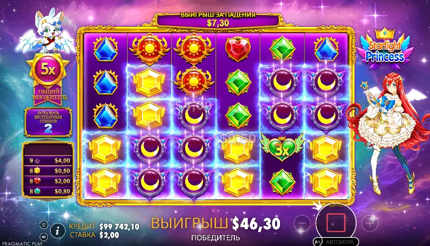 Візуальне оформлення слота заповнене деталями: фон переливається небесними відтінками, а барабани прикрашені символами кристалів, зірок та сердець. Зображення діляться на низькооплачувані та преміальні. Кристали різних кольорів приносять невеликі виграші, а корони, серця та сонця – більші. Особливе місце займає символ Scatter, зображений у вигляді головної героїні з написом «Scatter». Він активує безкоштовні обертання при випаданні чотирьох та більше символів. Ще одна важлива частина механіки – множники. Під час будь-якого оберта можуть з’являтися кулі з крилами та множниками від x2 до x500. Коли на барабанах формується виграшна комбінація, усі активні множники підсумовуються та застосовуються до загального виграшу. Це робить слот особливо привабливим, адже навіть один вдалий спін здатний принести солідний результат.